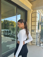 This active top features seamless construction, all-over ribbing, scoop neck, long sleeves, and Sommer Ray patch.