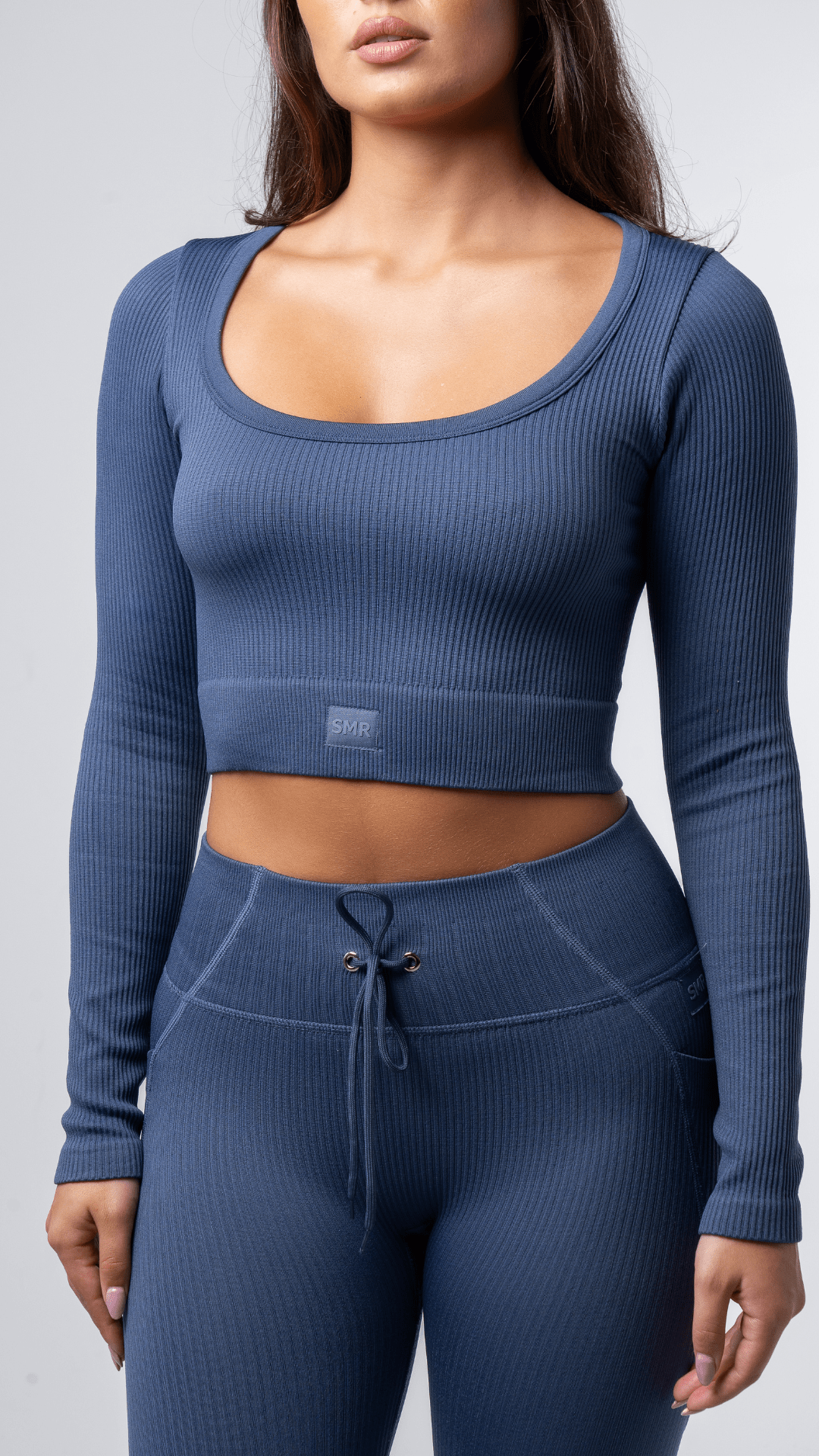 This active top features seamless construction, all-over ribbing, a scope neckline, and long sleeves.