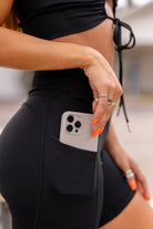 These biker shorts are constructed with a high-density knit and features a high-waisted v-cut front and two side pockets.