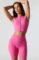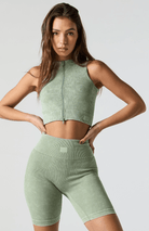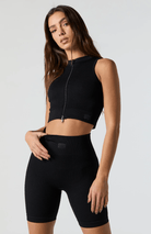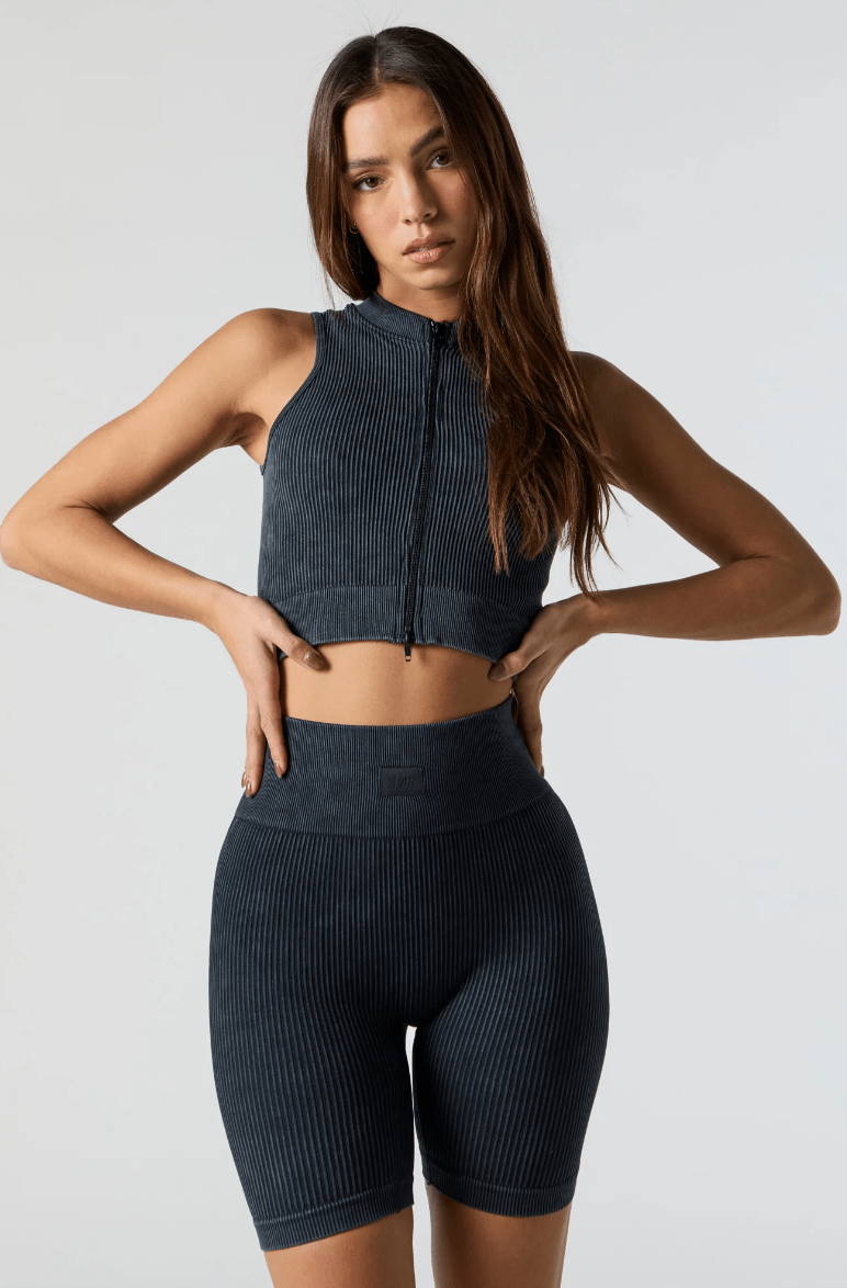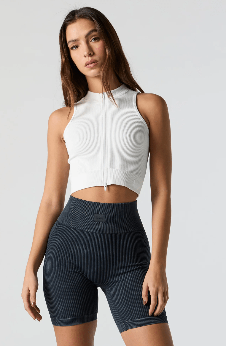 This tank features washed material, seamless construction, all-over ribbing, high neckline, zip-up front, cropped hem, and Sommer Ray patch.