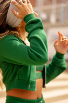 This cropped hoodie features zip-up front, two front pockets, drawstring hood, and ribbed knit cuffs.