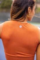 This top is constructed with a high-density knit fabric and features a crew neckline with a keyhole cut-out tie for adjustable comfort.