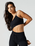 This sports bra features seamless construction, all-over ribbing, scoop neck, adjustable straps, and Sommer Ray patch.