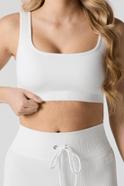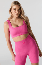 This bra features seamless construction, all-over ribbing, square neckline, sleeveless cut, and Sommer Ray patch